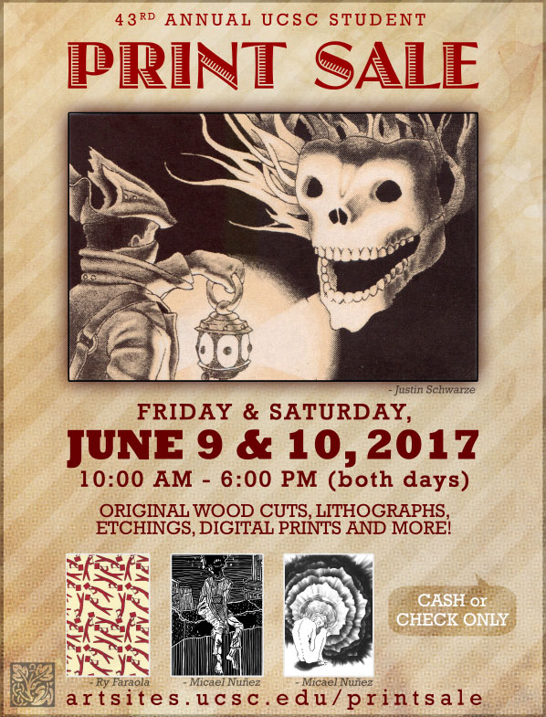 This annual event attracts people from all over campus and the greater Monterey Bay community. Print Media students get to sell their original artwork and the community gets to support budding artists while collecting beautiful art. Now that’s a win-win opportunity! Hundreds of original etchings, lithographs, woodcuts, digital prints, handmade books, and more will be on display and available for purchase at extremely reasonable prices. This is a unique opportunity to see and purchase high quality hand-made artwork, meet the artists and tour the exceptional art facilities at UCSC. Profits directly benefit the student artists and the UC Santa Cruz Printmaking Program. The sale can accept CASH & CHECKS ONLY (sorry, no credit cards).