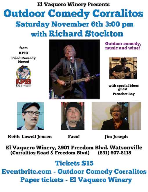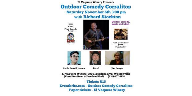 Corralitos, CA - El Vaquero Winery (at the intersection of Freedom Boulevard and Corralitos Road) will be the scene of a comedy extravaganza with host Richard Stockton and comedians Keith Lowell Jensen, Vaco! and Jim Joseph with special guest bluesman Preacher Boy.