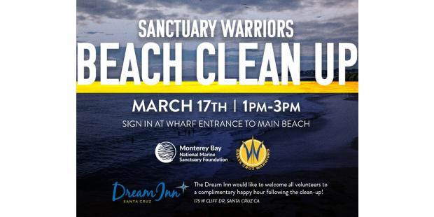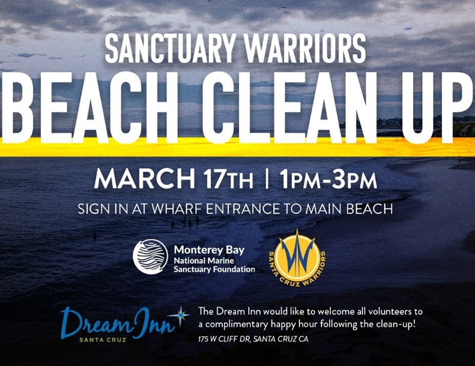 Please join us next Thursday, March 17th, from 1:00-3:00 pm as the Monterey Bay National Marine Sanctuary Foundation partners with the Santa Cruz Warriors Basketball organization and the Dream Inn Santa Cruz Hotel to help clean and protect our beautiful sanctuary! We plan to do a "deep clean" of Main/Cowell's Beaches in Santa Cruz. The Dream Inn Hotel will provide free food and drinks for participants following the cleanup. RSVP at the link and sign in at the wharf entrance to Main Beach to pick up cleaning equipment and register for the happy hour.