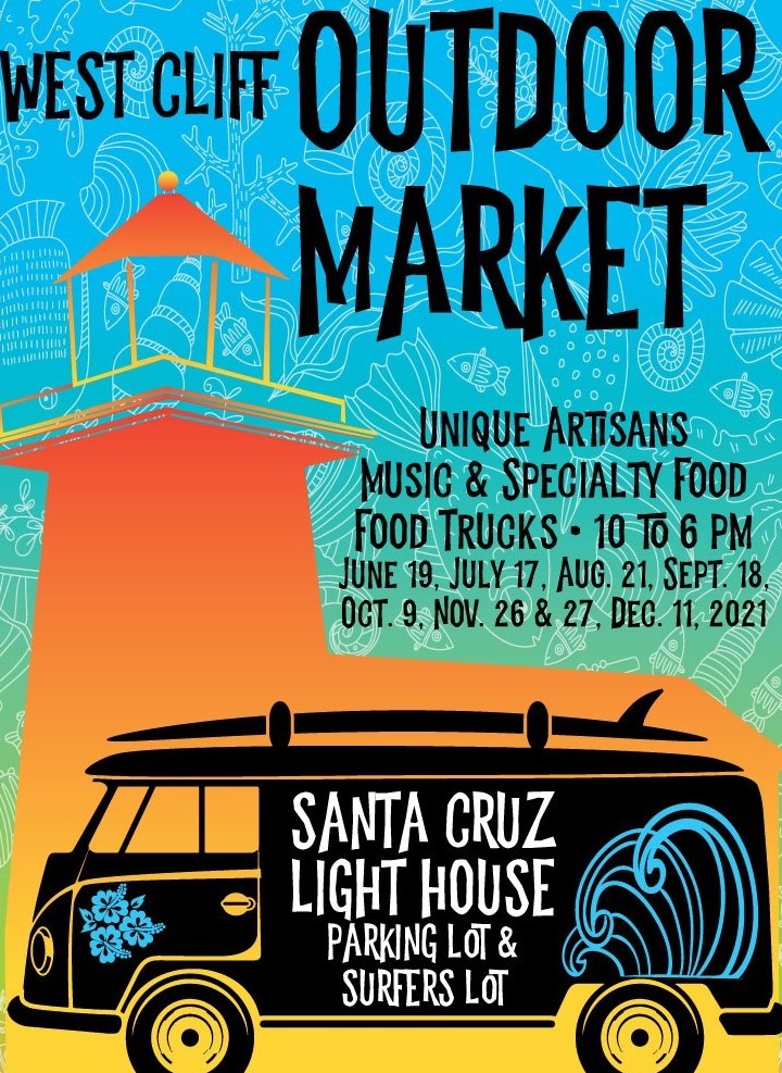 Come enjoy West Cliff Outdoor Market which will feature unique artisans and local food trucks. This one of a kind market will be held in two parking lots along West Cliff Drive in Santa Cruz. This is always a popular spot for locals and tourists, as it over looks the famous Steamers Lane surf spot. Enjoy the fresh air as you stroll among many artisan's booths and specialty food while taking in the view. Come enjoy the LIVE MUSIC and admission is FREE!