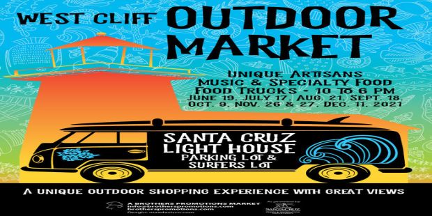 Come enjoy West Cliff Outdoor Market which will feature unique artisans and local food trucks. This one of a kind market will be held in two parking lots along West Cliff Drive in Santa Cruz. This is always a popular spot for locals and tourists, as it over looks the famous Steamers Lane surf spot. Enjoy the fresh air as you stroll among many artisan's booths and specialty food while taking in the view. Come enjoy the LIVE MUSIC and admission is FREE!