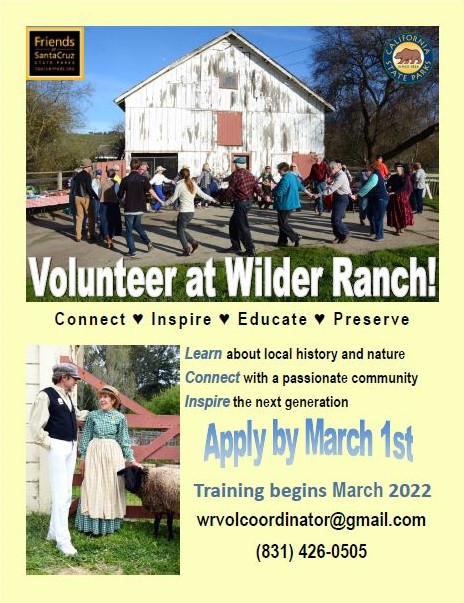 Help lend us a hand! Wilder Ranch State Park is looking for volunteer docents to share our beautiful and culturally significant ranch with school groups and visitors. Docents play a key role in special events, school programs, natural and cultural history tours, and visitor center operations. It is a minimal commitment with the ability to make a huge impact for visitors! Help us bring history to life and join our upcoming docent training course starting in March, 2022. The application deadline is March 1st 2022.