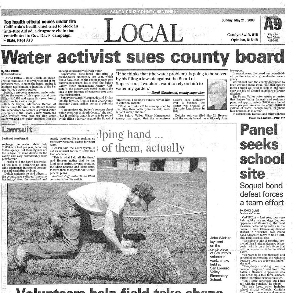 I have heard and read with much interest a number of Mr. Patton’s recent letters and statements on the radio and in news articles in this paper last week and elsewhere relating to our water, the new desal plant, UCSC expansion, Atkinson Lane development in Watsonville and other local land use matters in the Greater Monterey Bay Region. Yet, since 1998, I have never one time heard one word from Mr. Patton mentioning his “Well Ordinance” and its requirement, crafted by him, that our Board of Supervisors declare a “groundwater emergency” and implement the reasonable and required remedial measures he designed into the law to protect our water supply for us, our children and our grandchildren. I wish he would please explain to us all why he hasn’t and why he remains silent while his “Well Ordinance” and the water supplies it is designed to protect and conserve is ignored and disregarded continuously since 1998 by his successors, supervisors Wormhoudt and Coonerty, and, apparently, by himself as well.