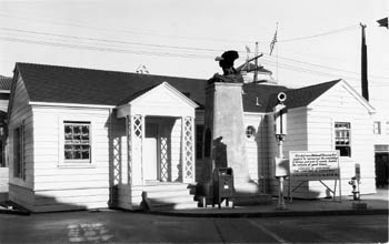 Shabby House: After, 1935. Last week's historic photo showed this house before it was remodeled. If you look carefully, you can see the Veterans War Memorial eagle statue, so we know the house stood temporarily right in front of the original Plaza Bakery, or today's Jamba Juice. Read below about the thrilling search for where this house is today.
