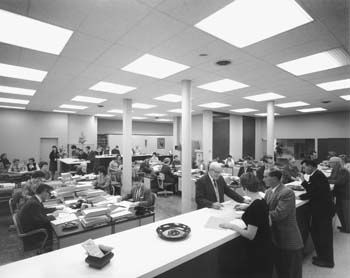 Inside the Metro Santa Cruz Offices, 1965: This was taken the same day as last week's historical photo--Jan. 28, 1968--at 1:48pm. This was the interior of the Santa Cruz Land Title Company at the corner of Front and Cooper streets, where the Metro Santa Cruz offices are now. That's Ernie Blevins at the desk on the left and Dick Knight seated across from him. Do note all the neckties and suits, and the guy at the counter is even smoking a cigarette--how times do change.