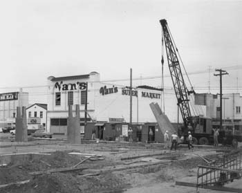 Longs Downtown Drug Store, the Beginning: This is the construction site at Front Street and Soquel Avenue on July 22, 1965. Note Van's Super Market and the Mission Drive-in Market where the Silver Bullet used to be. That corner is now the forever-ugly Front Street Parking Garage, an embarrassment to us all.