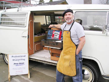 His current mobile office is a 1970 VW bus outfitted with grinding machine, tools, the knives he sells and good acoustic music. He makes house calls to private residences as well as servicing businesses in Santa Cruz and Monterey counties. If you call your foodie friends, tell them to bring their knives, and then invite Terry over, you've got a bizarre twist of Tupperware meets E. Scissorhands. I'll bring the tomatoes.