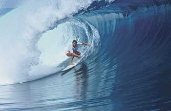 The music of Destination Point ranges from rock to reggae to furious punk, giving each scene a distinct feel. "I just try to get a feeling for the session," says Pomer. "If it's a real agro session with lots of airs and stuff, then I like to put faster music. But if it's like a more mellow soul session with long, perfect waves and long tubes, then it's kind of fun to mix in a slower beat."