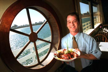 Not only do desserts not disappoint at Carniglia's, they are brought to your table for selection. The pastry tray offered a balance between chocolate and fruit possibilities--so we tried both. The house tiramisu--I know, I swore I wouldn't--was impeccable. And authentic. Barely sweet, it was a thin slice of multi-layers of mascarpone cheese and rum-soaked genoise, all dusted with chocolate ($6.50). It was easily enough for two people to share, but Jack was busy levitating over a slab of torte covered with ripe raspberries ($6.25). Both voluptuous desserts were adorned by unsweetened whipped cream, ripe strawberries and a beautifully drawn tracery of fruit purees. Our meal ended with a shared glass of Bonny Doon's impeccable Vin de Glacier ($4.50). Carniglia's is as generous with portions as it is with expertise--and besides, it's truly a room with a view.