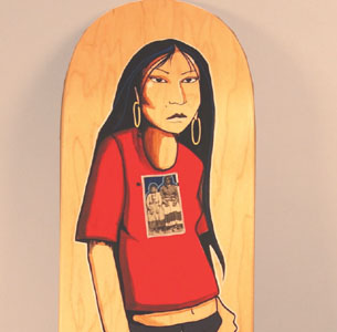 Miles' skateboards address themes that Apache youth face: coming to terms with their cultural history, the frustrations of living on the reservation and the unique perspective Native Americans have when addressing mass culture. In Castillo's words, Miles is painting "what he sees out his window--an approach that peaked the interest of Pancho Rodriguez, principal of Pajaro Valley High School, when he viewed some of Miles' work in a gallery in New Mexico. and then referred the work to Castillo during a chance encounter. The exhibition, much like its creator, is not static. On May 26, Miles gives a lecture. On May 28, he presides over an skate exhibition featuring his decks that are being utilized by the Apache Skate Team, a group made up of the reservation's finest riders.