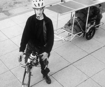 With its solar panels mounted on a trailer, the bike is a bit unwieldy for tooling around town--more suitable for a cross-country trek--which is good, considering that Clay was on his way to Colorado from Berkeley.