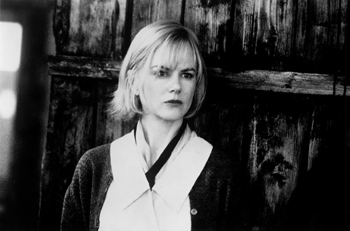 Lars von Trier reaches a watershed: Dogville is his first film in years without the Dogme certificate; and it features a genuine movie star, Nicole Kidman. Dancer in the Dark, von Trier's last release, inspired a mix of praise and fury. I doubt that we'll see the same outpouring of emotion over this cold, formal exercise. Acted on an almost bare stage with stenciled outline, Dogville looks like a project still on the drawing board. The film is a throwback to the era of early television, when they use to stage Hamlet against an Elsinore made out of packing crates.