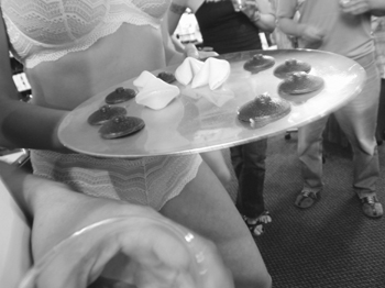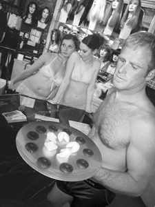 Or maybe you've always wondered what liquid latex was really like, and you finally understand what it's all about when the model offering you cream puffs and chocolate nipples is wearing nothing else from the waist up.