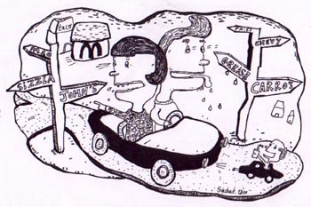 There is a rule on this planet that you will always have a hunger attack when you are furthest from any place that sells food. So get resourceful--it's part of the fun. Don't be afraid to break out of your old ruts. That's what road travel is all about. If you think of the quest for food as part of your vacation, you'll soon find you can actually enjoy a doughnut with that diet cola. Or, as we have, scarf down a New Year's Day dinner of Ralph's brand camembert, stone wheat thins and slices of pear. Salut!