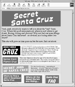 IGNORING THE typical monotonous list of hottest beaches, hippest stores, etc., Secret Santa Cruz asks, "Why not find out some things about Santa Cruz that aren't so obvious, nor boring either (we hope)?" The sparkling "Notes From Planet Cruz," described as "wide-eyed dispatches from the land of the trust-fund hippie and the 60-year-old surfer dude," serves up amusing insights about the changing face of the college town time is trying to forget. The FAQ section even tackles the clueless request: "Where can a 22-year-old with a BA in philosophy find employment in Santa Cruz? I've got a head full of theory and no outlet." The answer, in brief: "Retail." (Not to mention armed robbery.)