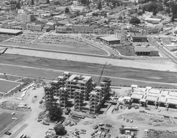Construction Sites Downtown, 1965: It's easy to see that the County Building is progressing; what's harder to make out is that the Sentinel building is also under construction. There were two gas stations at the intersection of Pacific and Mission, and another one at Center and Mission. The McHugh-Bianchi building was still there, the Octagon had that ugly addition on Front Street, there was the real Cooperhouse and the Eric's Deli/Zanotto's building was all enclosed by the huge doors. In addition too all that, the Post Office annex was also being built.