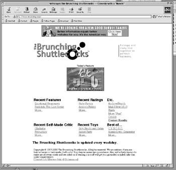 HUMOR IS IN THE CRAW of the beholder, which is why online satire is so handy. If one piece doesn't evoke guffaws, another shot is just a click away. The Brunching Shuttlecocks--Santa Cruz's L. Fitzgerald Sjöberg and Santa Monica's Dave Neilsen--publish (and archive) a lot of their own storm-the-Zeitgeist zingers, along with posting over-the-cyber-transom submissions. Their Alanis Morissette Random Lyric Generator (fill in the blanks with "One thing you really hate," "Your favorite poet, "The name of an ex" and so on) has already gained a considerable reputation. The Ratings Section grades everything from Party Favors to Aesop's Fables ("The Fox and the Grapes" gets a C-). Junk-movie fans will appreciate the Self-Made Critic's no-nonsense reviews: "The main problem with [Gladiator] is that the lopping-off-of-heads factor (LOOF) is too low."