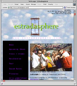 EVERYONE KNOWS that purveyors of everything bizarre Estradasphere puts on one of the best shows in town. What some folks don't know, though, is that the Estradas have a superb, visually and mentally stimulating website with tons of goodies. Makes porn and MP3s downright boring. There's plenty of color, with a misleading baby-blue sky background, plus photos of the band in Backstreet Boys attire and live pics of the circus (glam shots of the Death Metal Cheerleaders will always get my vote). The best material has to be the "news," which chronicles happenings of the band and circus. Spiritual leader and yoga meister Greg Enyart has started giving advice over email, and MC/pimp Bob Hathaway is now a permanent member of the crew. With an entire maze of info, from tour updates to soundbytes and merchandise (each option with a pop-up picture of a Days of Our Lives character), any fan would be entertained and disgusted for hours. Estradasphere's website gets an 11 out of 10: so much to read and gawk at. With the band out on tour, the site will no doubt serve as a home base for spreading the Estradasphere disease across cyberspace.