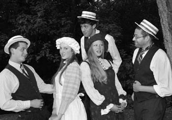 Sams' script draws on Santa Cruz history, stereotypes and ribald humor to tell a meandering tale of an imperiled Santa Cruz Mountains town that is little more than a stagecoach stop during the 1910s. Set inside the Loathsome Lodge, Sams' Love on the Loathsome Stage involves a frivolous plot featuring a villain, a trio of dance-hall women, three orphans bound for marriage to three absent husbands and three fraternity pledges from Stanford University. Unlike classic melodrama, Sams doesn't provide the audience with a clear hero--just a clear villain in the character of Parson Weems (Marcello Siero). Weems has designs on his newly acquired property, starting with a plan to run all of the scoundrels--basically the entire populace--out of town.