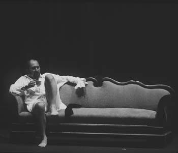 Thanks to Whitworth's intelligent reading, there is some real behind-the-scenes magic--the true stuff of stagecraft--in this three-hour production. Two scenes stand out. In one we watch as Whitworth/Kean begins to apply blackface for Kean's benefit performance of the last act of Othello, all the while complaining to his butler Solomon (played absently by W. Francis Walters) about some romantic rendezvous gone wrong. Whitworth furiously applies greasepaint, straps on a sword, steps into royal robes and dons a black wig--still talking, gesturing, in constant motion. Suddenly, magically, it is Othello who stands before us--or rather Whitworth playing Kean playing Othello.