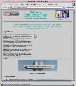 THIS IS AN incredibly elaborate site about a deceptively simple subject--the dogs and people who frequent Lighthouse Field in Santa Cruz. I've always suspected that people have dogs in order to meet other people who have dogs, and this site confirms it. Of course, dogs not only break the ice, they inspire grand and often lofty sentiments among people who adore them. This site contains photo directories of dogs, calendars of dog events and parties, local dog-emergency services and photos of dogs playing their favorite games. Especially nice are the Halloween pics of dogs in tutus--apparently the dog costume of choice. The creators of lighthousedogs.com don't exclude any canine enthusiast, and to demonstrate their canine inclusiveness they have translated their name into Spanish and even Ohlone, a touching tribute to the very first residents of the area. For some reason, the site also provides a large selection of high-quality aerial photos of Santa Cruz and its environs.