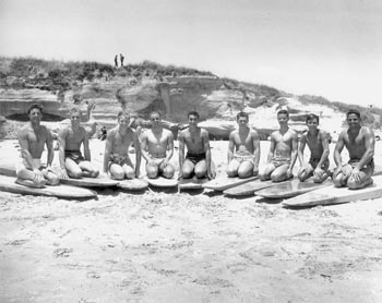 Santa Cruz Surf Club, June 8, 1941: Some of these guys now nearing their 75th birthdays are probably still around town and probably still surfing. These tall-board, early surfing photos are often seen around here, but what makes this one unique is that Covello & Covello Photography has the original negatives. Those boards must be 12-feet-plus!