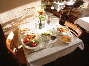 The vivid artwork on the walls--it changes often and always rewards a second look--lends a distinctive ambience to the vintage '20s interior. I've always loved this room, especially at lunchtime when the handwritten menu seems to offer the most in the way of wittily crafted and unusually choreographed small plates. Pacing can be as leisurely as you like, which was fine with us since Simone and I had a lot of men, travel and politics to catch up on. Beautiful soft light crept in from the tiny inner courtyard--I'm convinced that flattering light is yet another of the attractions of this popular dining room.