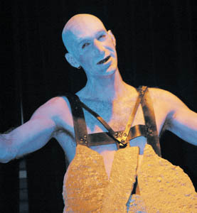 During the piece, an apocalyptic dirge by Idiot Flesh called "Chicken Little" pronounced civilization doomed, as Donovan and his models, sparsely clothed and painted a pale, ashen gray, were re-embedded not so much in natural clothes but in nature itself--a chaotic and sinister nature that menaced them with sharp sticks and the unrelenting dead weight of slate.