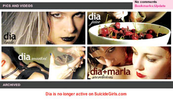 Choosing to abandon her modeling agency, the Northern California-based Dia entered into the Suicide Girls universe with great excitement over the possibility of controlling the context of her images. Rather than a pornographic exploit, she saw her participation as a kind of living
