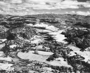 Scotts Valley, 1958: If they don't crop it out, you can see Camp Evers at the intersection of Scotts Valley Drive, Mount Hermon Road and the beginnings of Whispering Pines Drive sort of at the lower left corner. Look at all that vacant land--why, if we'd thought ahead, we could have created the world's first million-acre campus and leased it to Microsoft or Cisco or tomorrow's miracle business.
