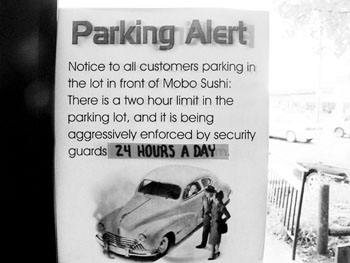 Told about these, er, PR disasters, LORI THERIAULT, property manager for HOWARD PROPERTIES INC., which oversees the lot, said regarding Beal's experience that while Mobo Sushi pays $300 a month for parking, their privileges actually exist in "another neighboring lot that we don't manage."
