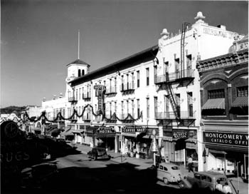 CHRISTMAS ON PACIFIC AVENUE, 2PM, 1946: The quaint St. George Hotel was built in 1895 and remodeled in 1912. Believe it or not, it was in the Spanish Colonial Revival Style originally. It was completely rebuilt after the 1989 earthquake. I've never heard any stories about why it was named the St. George, anybody know any?